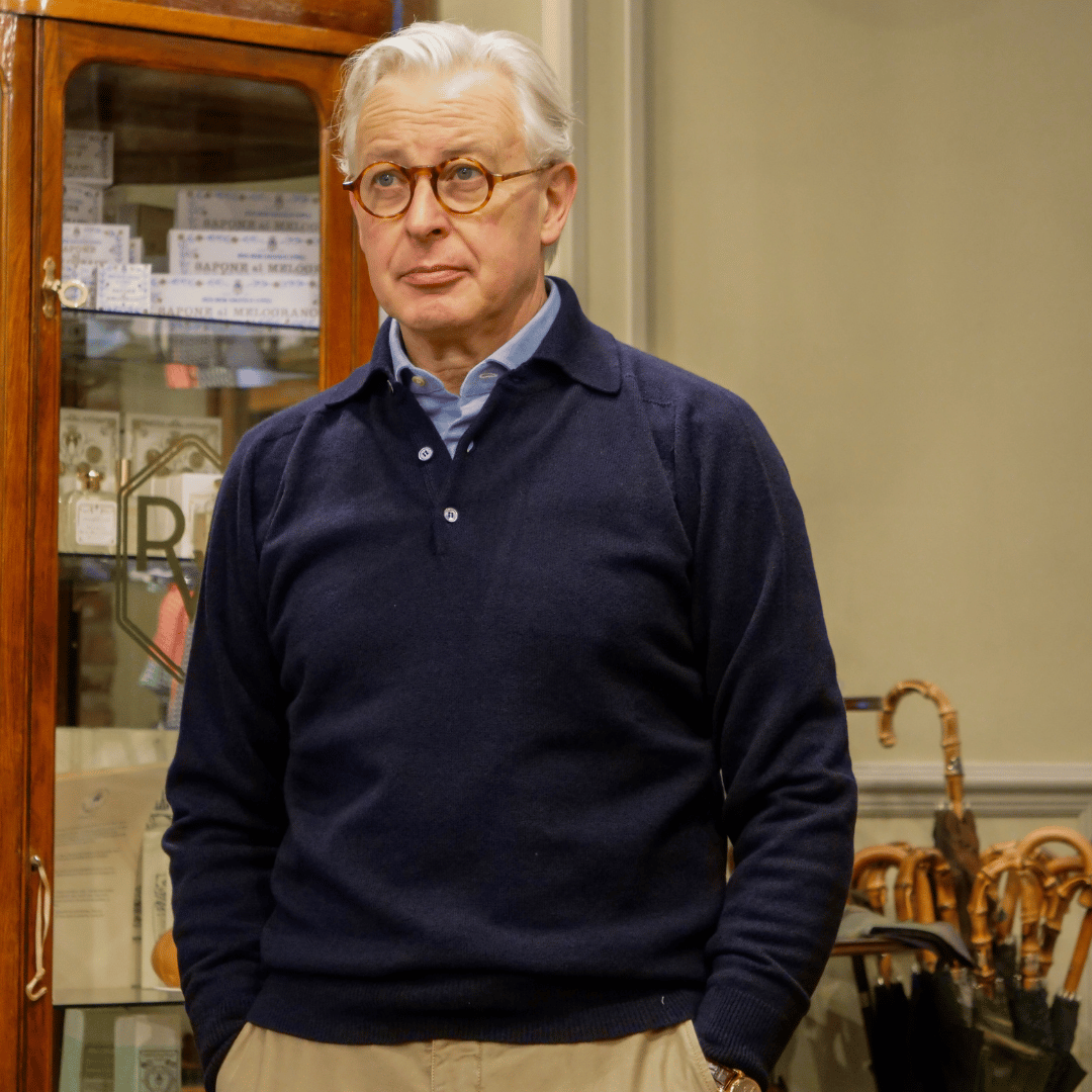 A seamless knitted polo knitted in Scotland from soft Geelong lambswool. It has a smooth, comfortable fit with no seams and a classic 3 button open collar. Warm, lightweight, and easy to wear—an everyday staple with a clean, refined look.